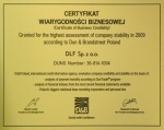 DLF Sp. z o.o. otrzymała Certyfikat Wiarygodności Biznesowej. Jest to prestiżowe wyróżnienie nadawane przez Dun & Bradstreet Poland. Do grona uhonorowanych mogą należeć wyłącznie firmy o najwyższej ocenie stabilności. Dun & Bradstreet Poland jest specjalistą w sporządzaniu raportów handlowych na temat firm na całym świecie. Ocena wiarygodności i stabilności firmy, przygotowana przez analityków D&B, wystawiana jest na podstawie: