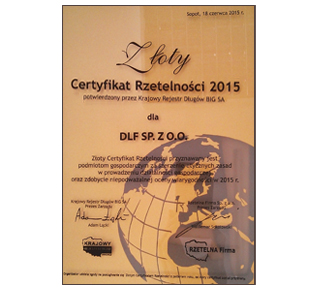 DLF Sp. z o.o. po raz kolejny została uhonorowana Złotym Certyfikatem Rzetelności potwierdzonym przez Krajowy Rejestr Długów. Wyróżnienie to przyznawane jest firmom za szerzenie etycznych zasad w prowadzeniu działalności gospodarczej oraz zdobycie niepodważalnej oceny wiarygodności . DLF Sp. z o.o. uczestniczy w programie Rzetelna Firma nieprzerwanie od 2010 r. i udostępnia szereg informacji świadczących o swojej wiarygodności.